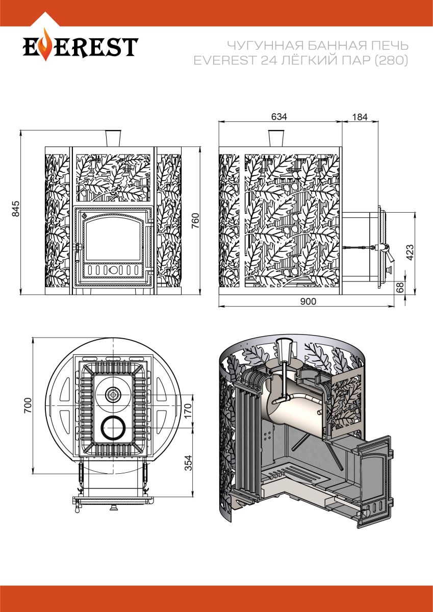 Чугунная печь для бани «Везувий Эверест 24 (280)» рассчитана на использование в парных помещениях средних размеров 15-25 м3. Печь идеально подходит для создания температурного режима «русская баня».