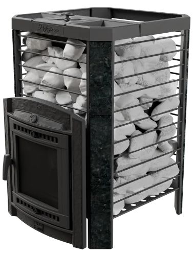 Модель повышенной мощности, обеспечит максимальное количество пара в больших помещениях. Кожух печи изготовлен в виде сетки из нержавеющей стали с прямоугольными ячейками и полностью заполняется природными камнями, обеспечивая высокую динамику нагрева парильного помещения.
