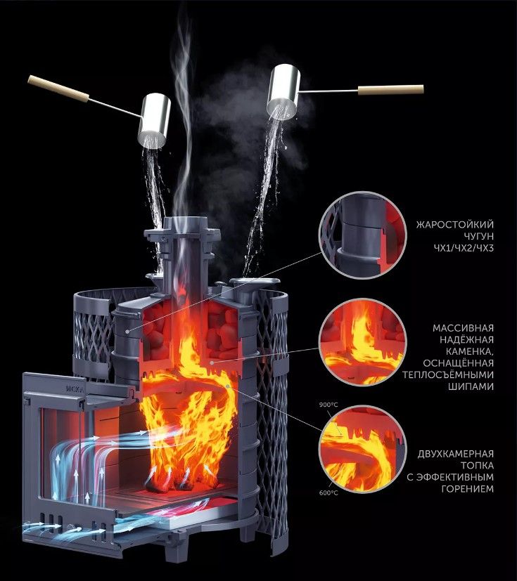 Чугунная банная печь с прямым нагревом парообразователя. Печь эконом-класса со стенками толщиной 14 миллиметров быстро нагревает воздух в парной и производит качественный мелкодисперсный пар за счёт теплоёмкой каменки, оснащённой теплосъёмными шипами на нижней поверхности.