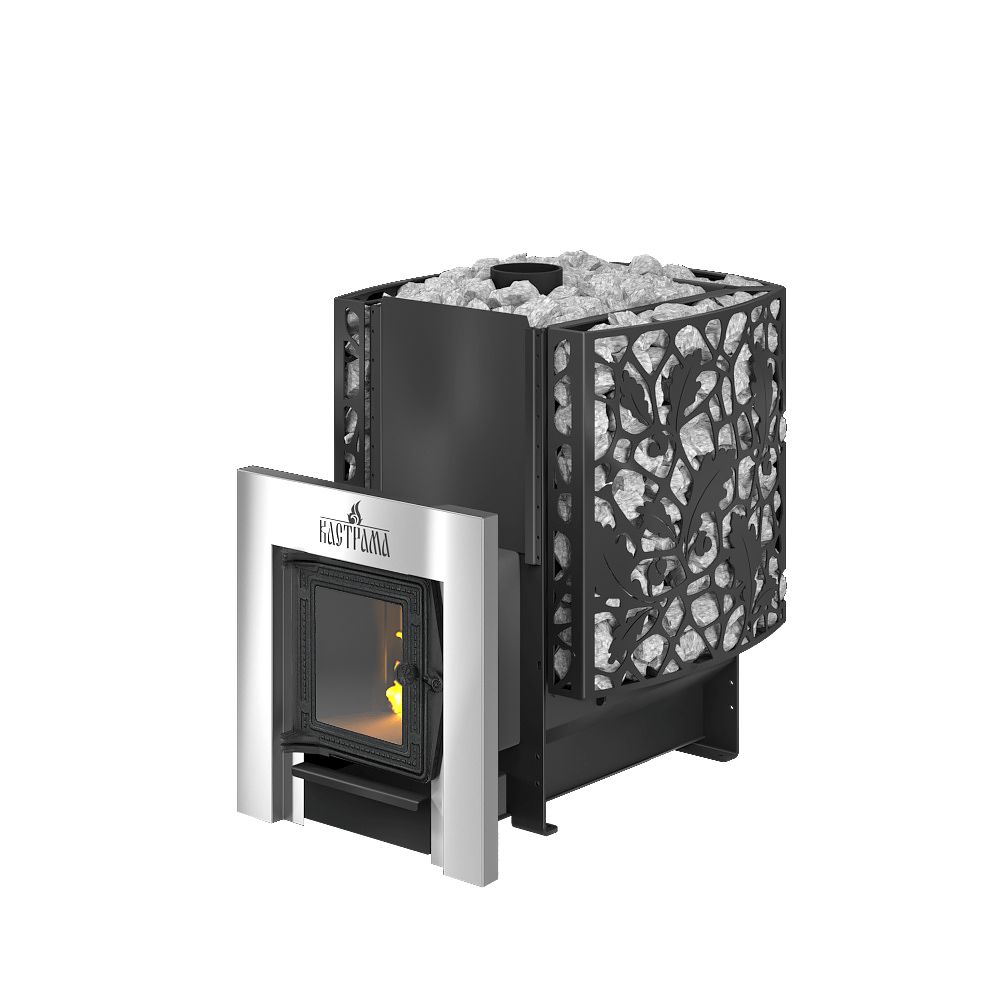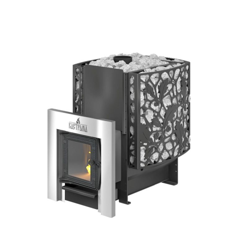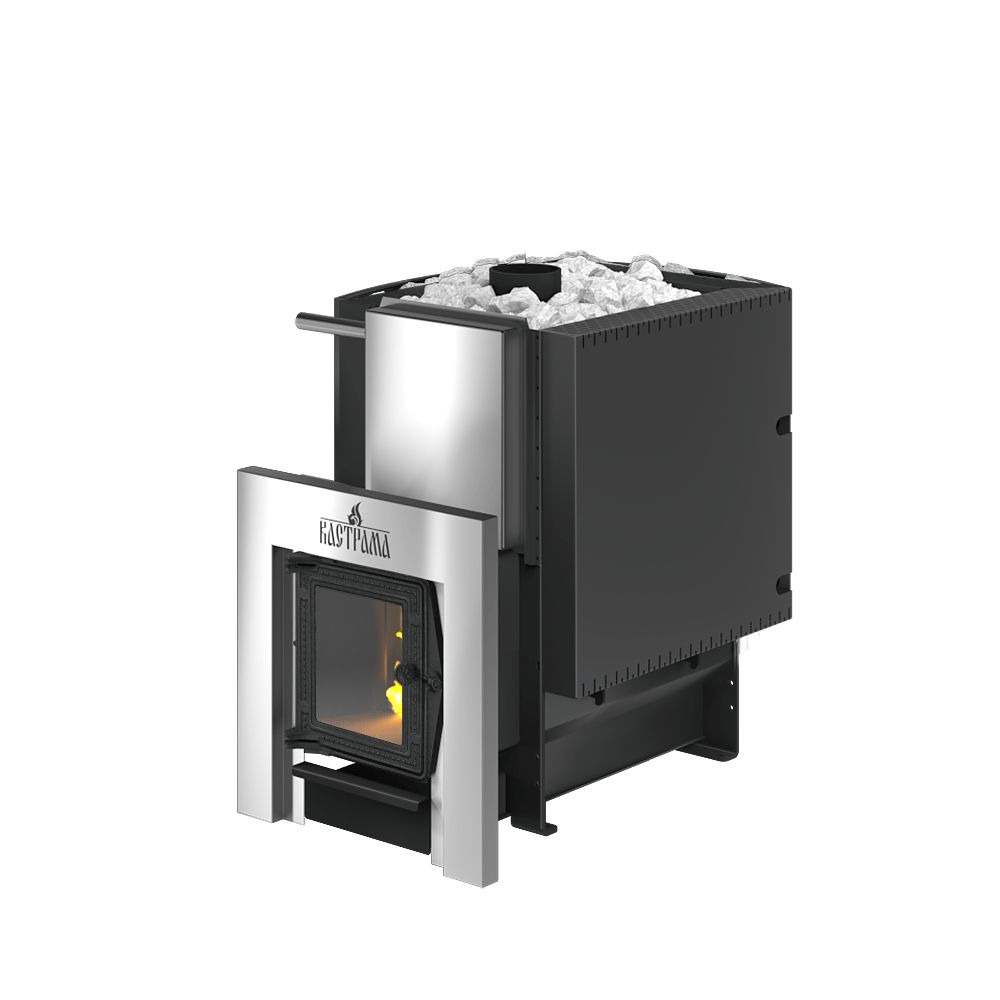 Печь для бани с открытой каменкой и дверцей со стеклом.