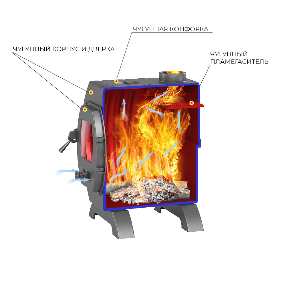 Топка состоит из двух чугунных элементов толщиной не менее 12 мм.