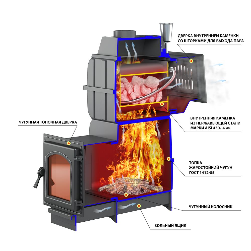 Все элементы топки отлиты из жаропрочного чугуна и соединены между собой с помощью болтового соединения через термостойкий шнур и герметик, а закрытая каменка изготовлена из жаростойкой высоколегированной 4 мм нержавеющей стали.