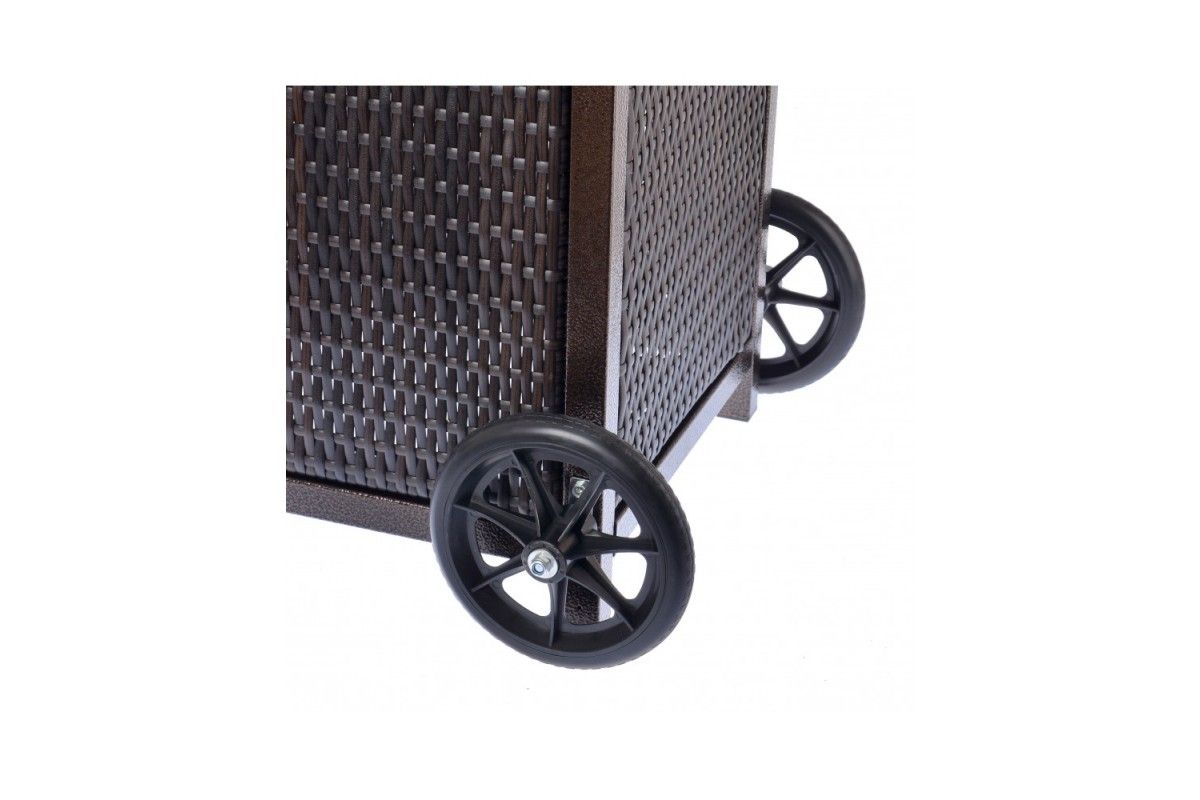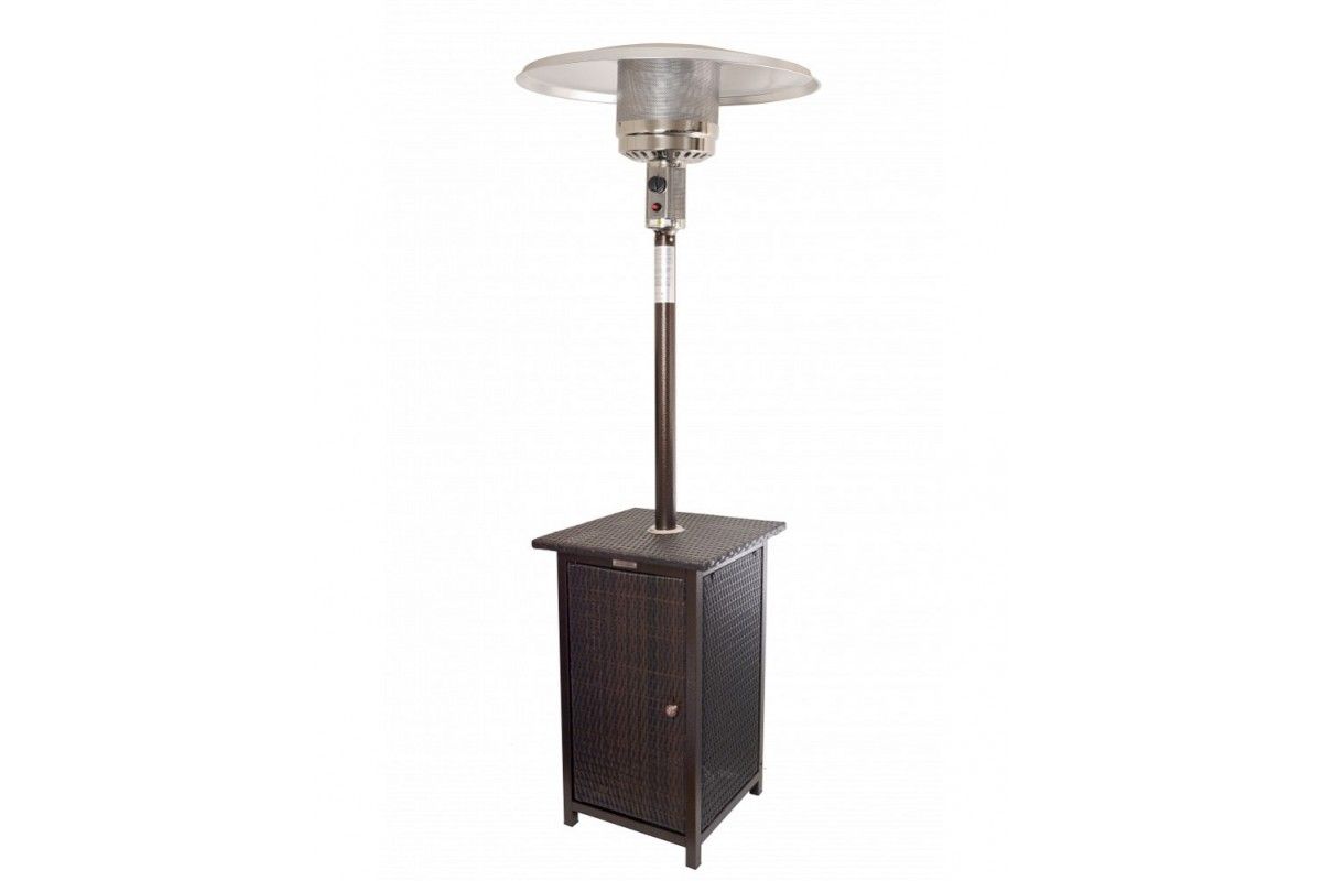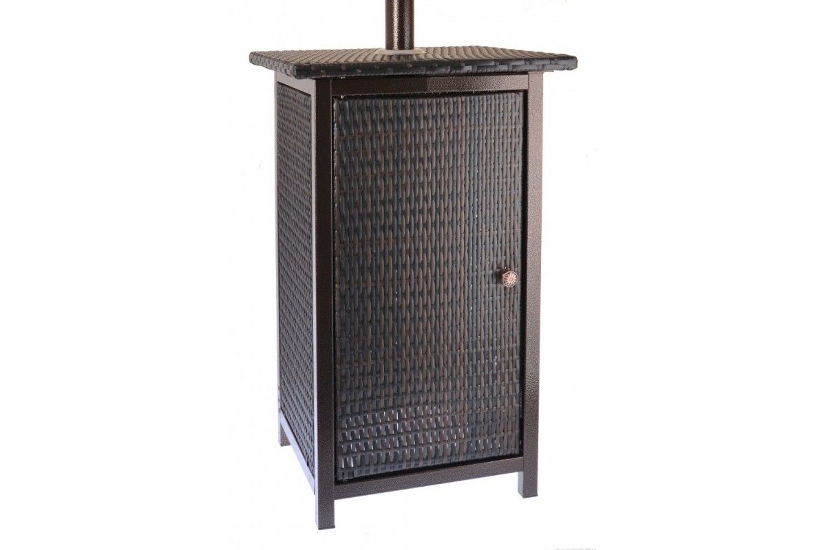 Корпус уличного газового обогревателя Ställeh Torg Rottang, купить который можно по самой привлекательной цене, выполнен в виде вертикального квадратного шкафчика, фасады которого имитируют плетение из ротанга. Внутри помещается баллон из композита (емкость 24,5 л) или из стали (емкость 27 л). Комплектацией предусмотрены довольно большие колесики, обеспечивающие удобство перемещения прибора по неровной поверхности.